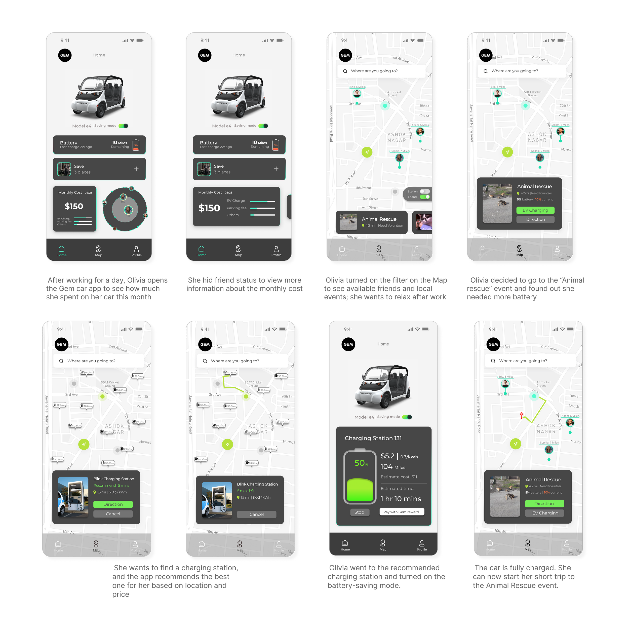 Through the design of a mobile app and car dashboard, our goal is to support users in discovering local events, building social connections, managing Gem car charging expenses, and enhancing the overall user experience with integrated AI technology and voice control.