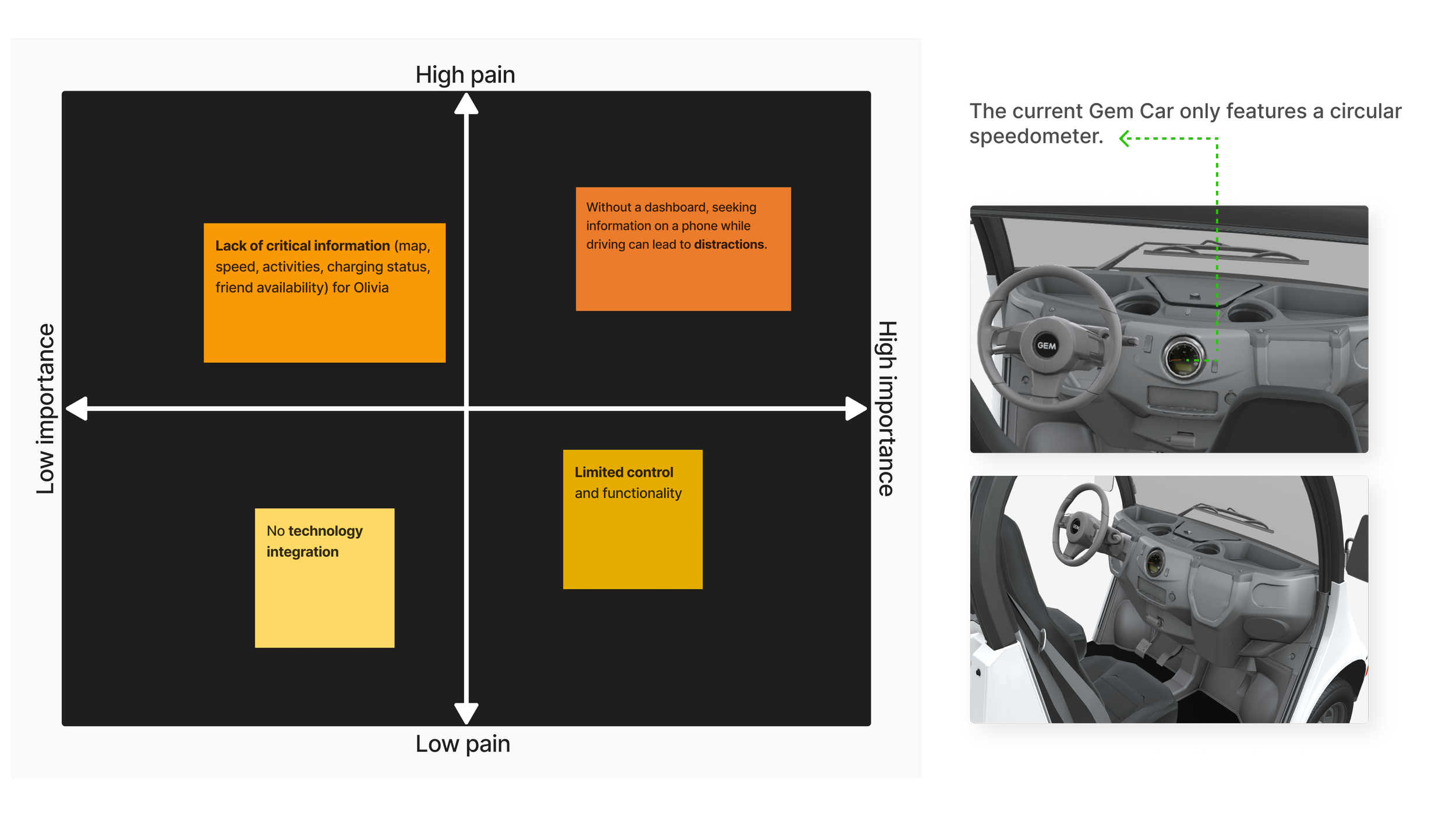 The current Gem Car dashboard only features a circular speedometer, making it challenging for drivers to access important information. This limitation can lead to distractions while driving and attempting to check information on a phone.